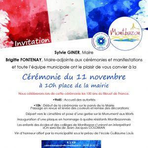 Sylvie GINER, Maire et Brigitte FONTENAY maire-adjointe aux cérémonies et manifestations ont le plaisir de vous convier à la Cérémonie du 11 novembre.