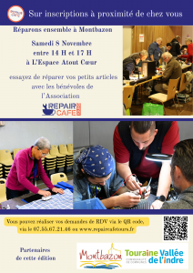 ➡ Samedi 8 novembre de 14h à 17h à l’espace Atout Coeur 🧐 Manifestation gratuite avec l’accompagnement de bénévoles de l’association REPAIR CAFE Inscrivez-vous au 07.55.67.21.46 / www.repaircafetours.fr / via le QR CODE ci-dessous 👇